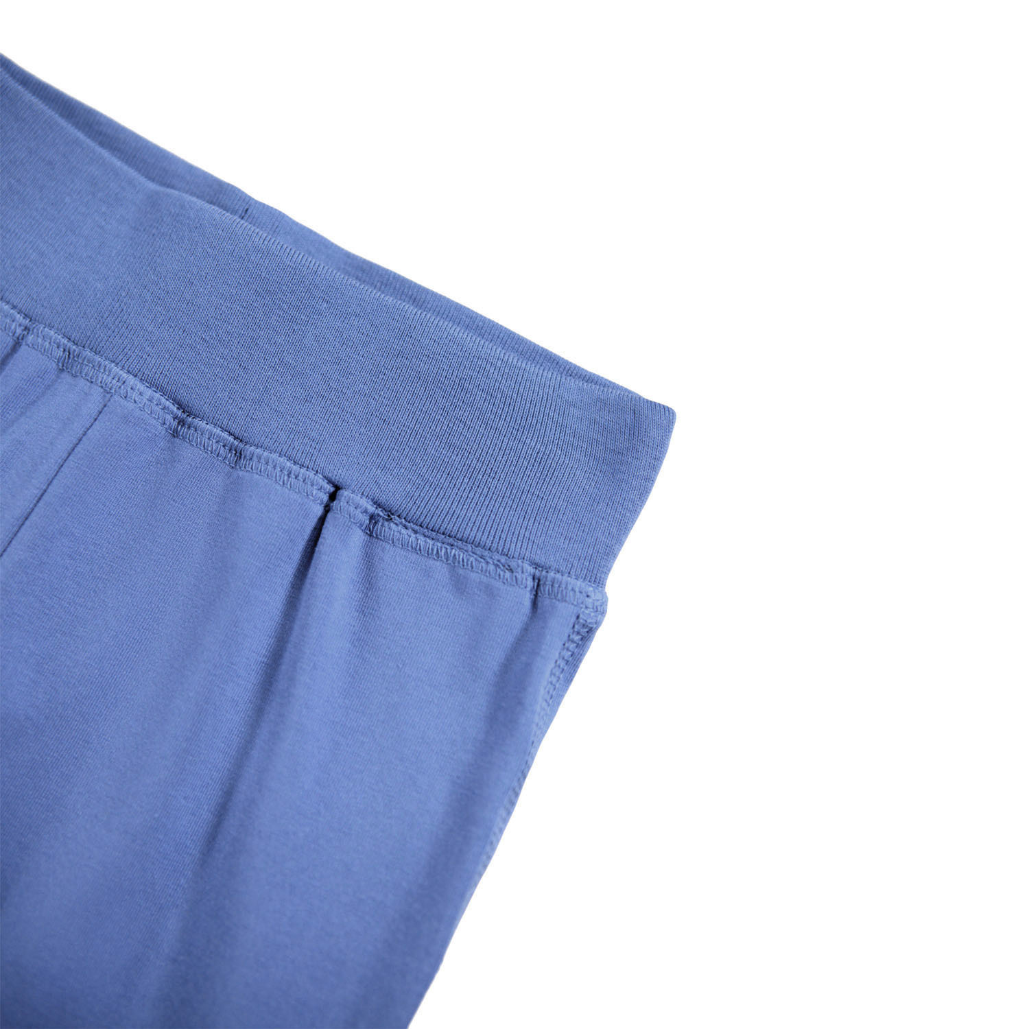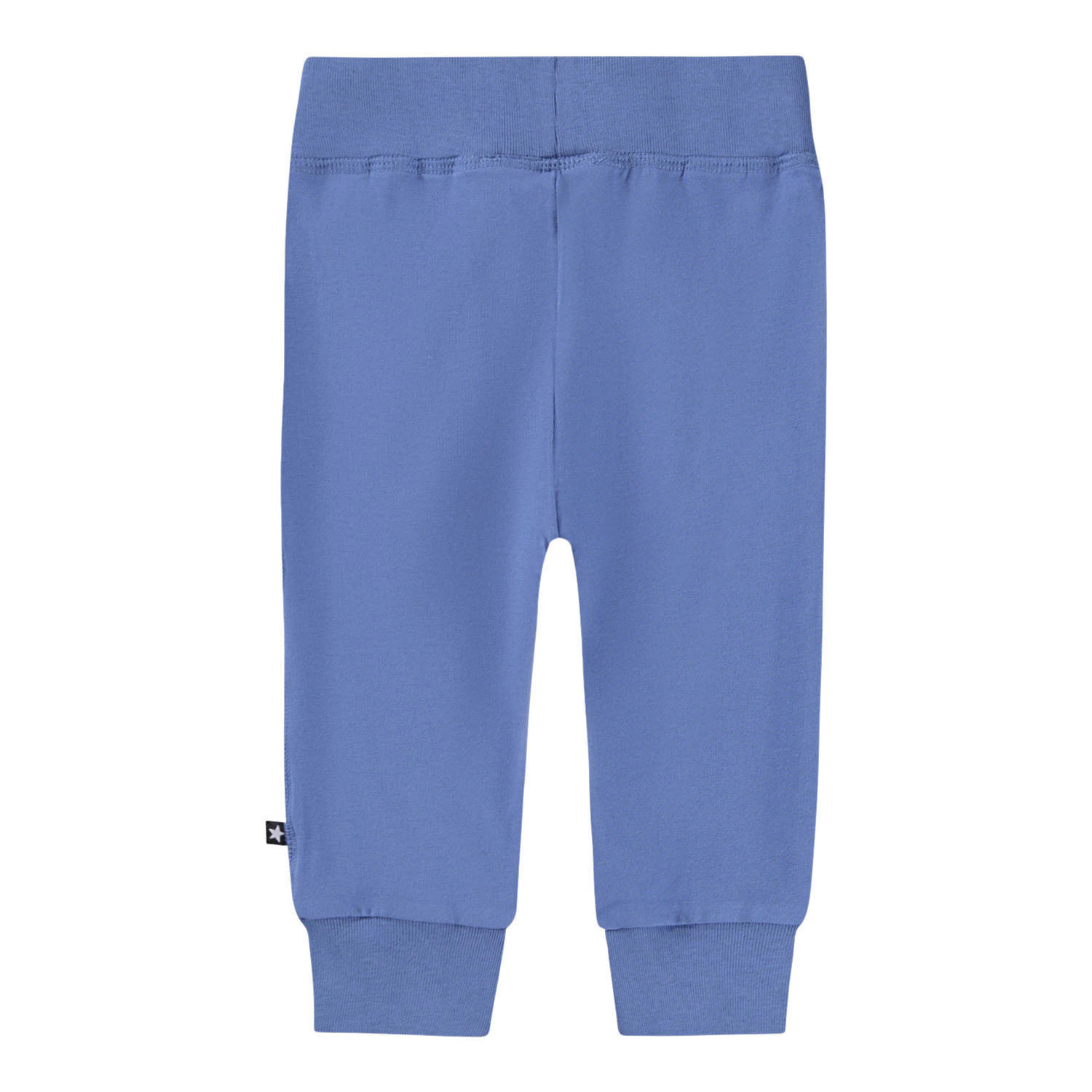 Blue pants for the little ones made of organic cotton jersey. The pants have a wide elastic ribbed waistband and leg cuffs and visible stitching at the front. They are soft to wear and provide plenty of room to move.This Molo product is GOTS Organic certified by Ecocert Greenlife, License no. 197496. Read more about the GOTS standard here.