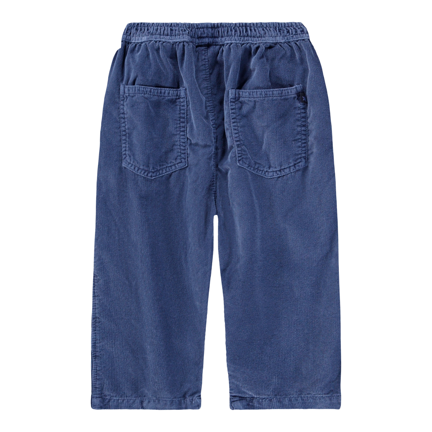 Blue corduroy pants for the little ones made of organic cotton. The pants have a loose fit with front and back pockets and an elastic waist that makes them easy to put on and take off. The light and airy design ensures plenty of space to move and at the pocket you will find a small embroidered smiling face.