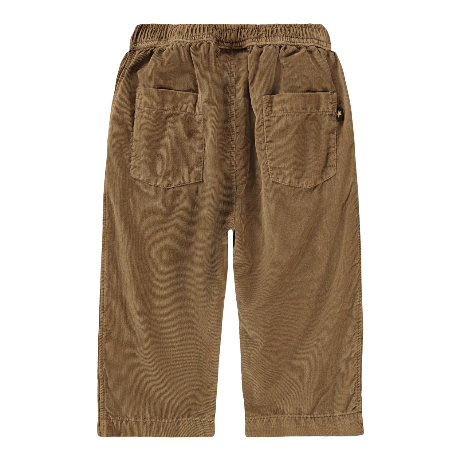 Brown corduroy pants for the little ones made of organic cotton. The pants have a loose fit with front and back pockets and an elastic waist that makes them easy to put on and take off. The light and airy design ensures plenty of space to move and at the pocket you will find a small embroidered smiling face. Combine the pants with the matching sweatshirt to get a complet.
