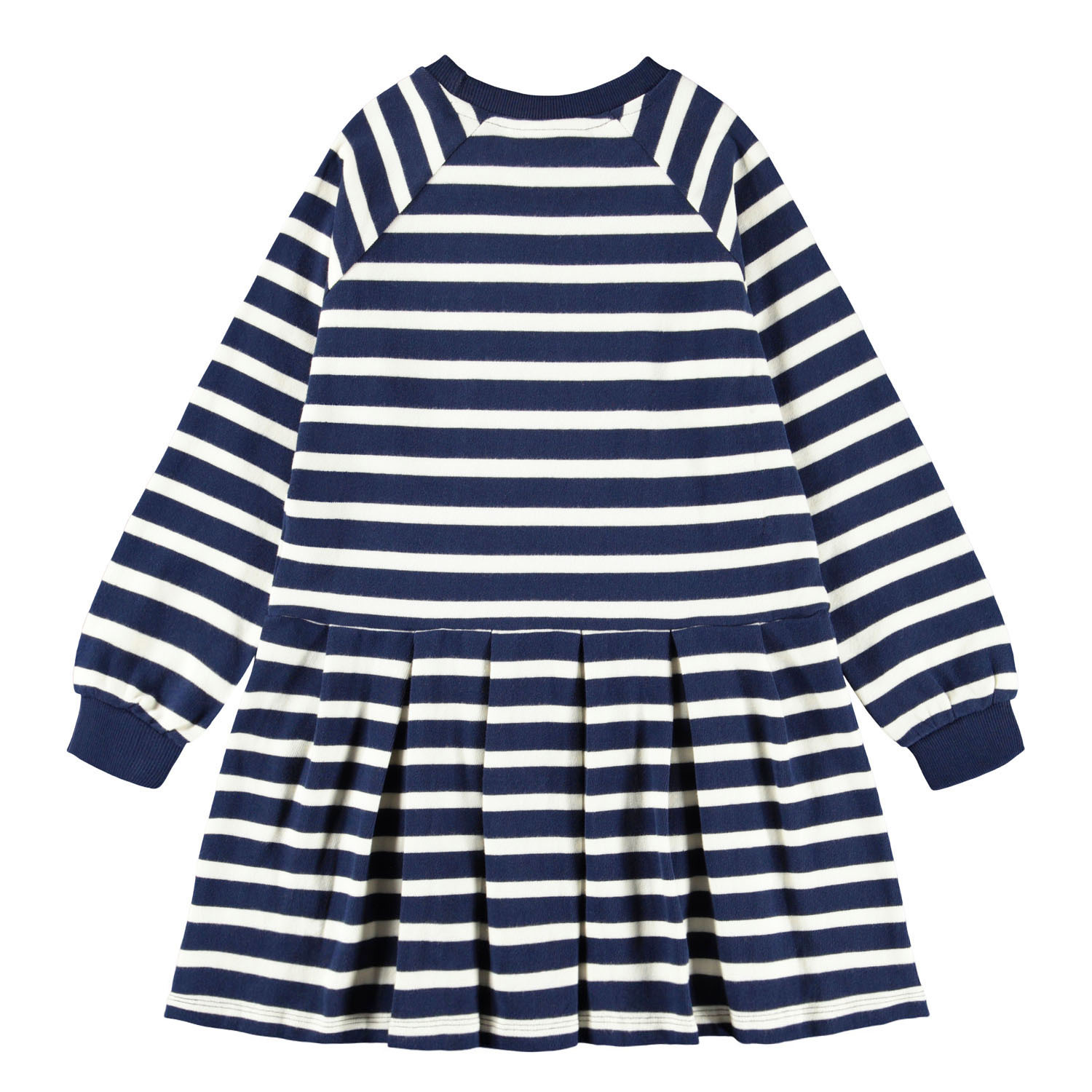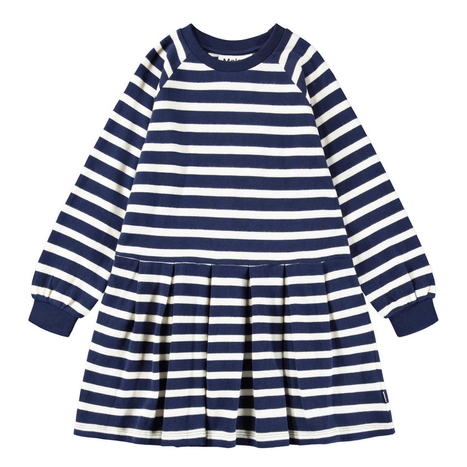 Long-sleeved sweatshirt dress made of organic cotton with Breton blue and white stripes. The dress has raglan sleeves, blue ribbed edges around the neck and sleeves, as well as an attached skirt with pleats, which gives a nice effect.This Molo product is GOTS Organic certified by Ecocert Greenlife, License no. 197496. Read more about the GOTS standard here.