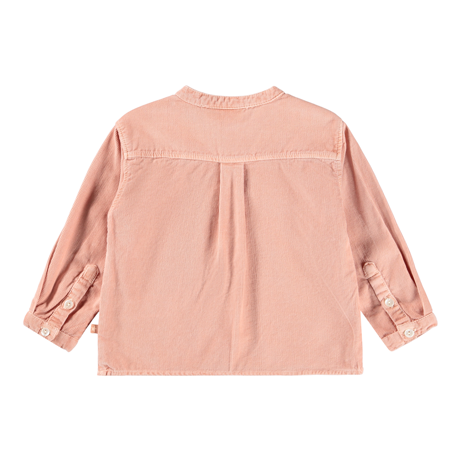 A pink shirt in pin wale corduroy for small children. This shirt is in 100% cotton, has long sleeves with a mandarin collar and an easy button closure at the collar and the sleeves.